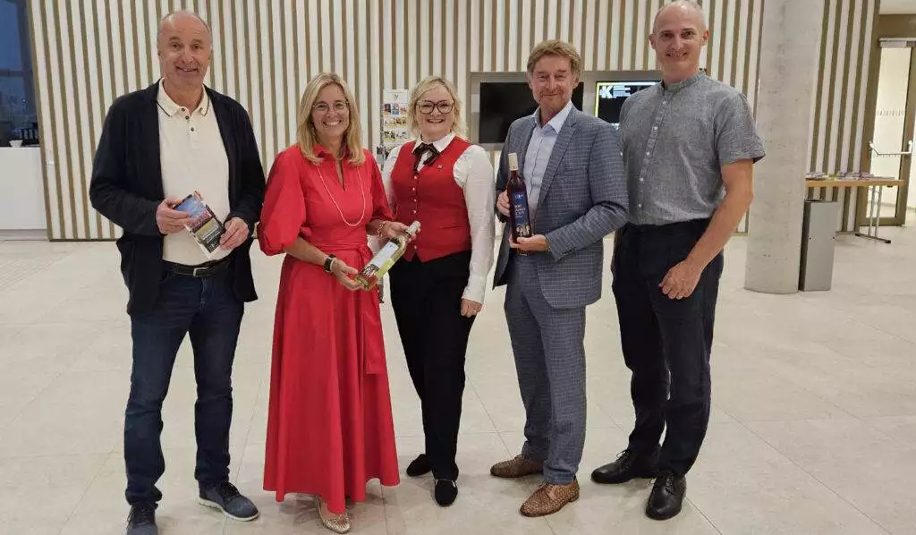 In diesem Rahmen überreichte der scheidende EMV-Kapellmeister und langjährige Intendant der Konzertreihe Konsulent Wolfgang Homar (im Bild l.) Vizebürgermeister Gerhard Kroiß (2.v.r., er vertrat Bürgermeister Dr. Andreas Rabl) und Kulturreferentin Vizebürgermeisterin Christa Raggl-Mühlberger (2.v.l.) den vereinseigenen Jubiläumswein. Auch Mag. Carmen Zeitlinger (Obfrau MV Jung St. Marien, m.) und Bezirkskapellmeister Dipl.-Ing. Christian Weixlbaumer (r.) feierten mit.