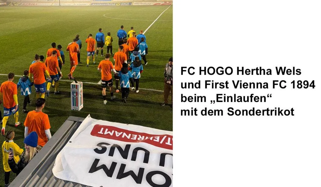 • Beide Teams liefen in Sondertrikots auf, die eigens für diesen Anlass gestaltet wurden, versehen mit den Logos des FC HOGO Hertha Wels, der First Vienna FC 1894 und nimmerallein, sowie den Unterschriften der jeweiligen Startformation.