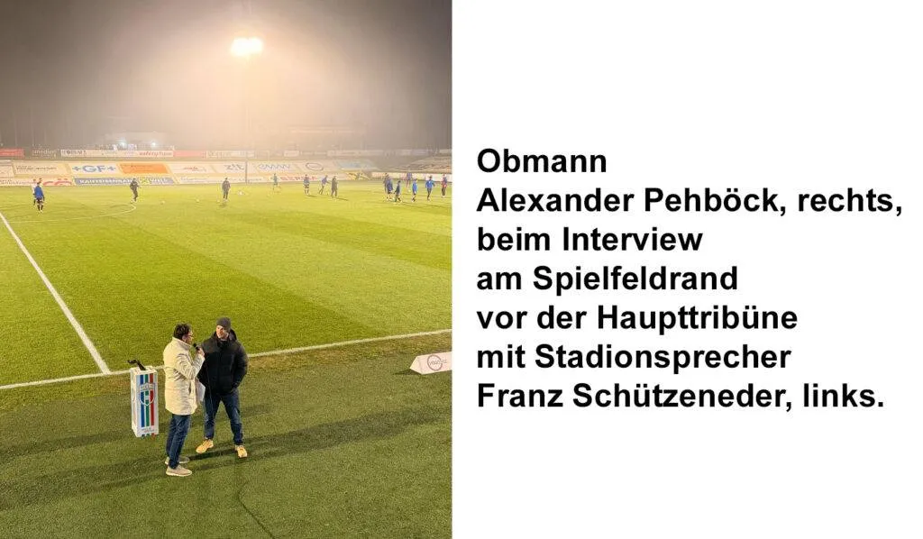 • Kurz vor Spielbeginn führte Stadionsprecher Franz Schützeneder ein Interview mit Vereinsobmann Alexander Pehböck direkt am Rasen.