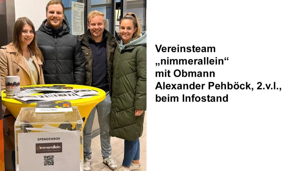 • Im Eingangsbereich der Arena informierte ein Infostand über die Arbeit von nimmerallein, inklusive Spendenbox und persönlicher Gespräche.