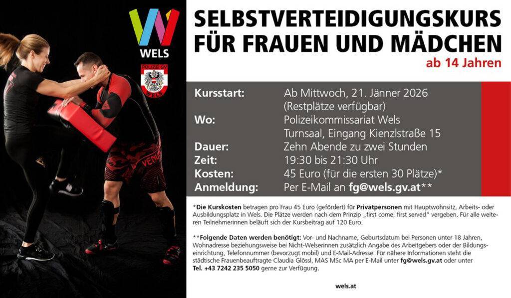 Der Kurs findet wöchentlich jeweils von 19:30 bis 21:30 Uhr im Polizeikommissariat Wels (Turnsaal, Eingang Kienzlstraße 15) statt. Anmeldungen für die von der Stadt geförderten Kursplätze sind nur für Privatpersonen jederzeit per E-Mail unter fg@wels.gv.at unter Angabe folgender Daten möglich: Vor- und Nachname, Geburtsdatum bei Personen unter 18 Jahren, Wohnadresse beziehungsweise bei Nicht-Welserinnen zusätzlich Angabe des Arbeitgebers oder der Bildungseinrichtung, Telefonnummer (bevorzugt mobil) und E-Mail-Adresse. Für nähere Informationen steht die städtische Frauenbeauftragte Claudia Glössl, MAS MSc MA per E-Mail (siehe oben) oder unter Tel. +43 7242 235 5050 zur Verfügung.
