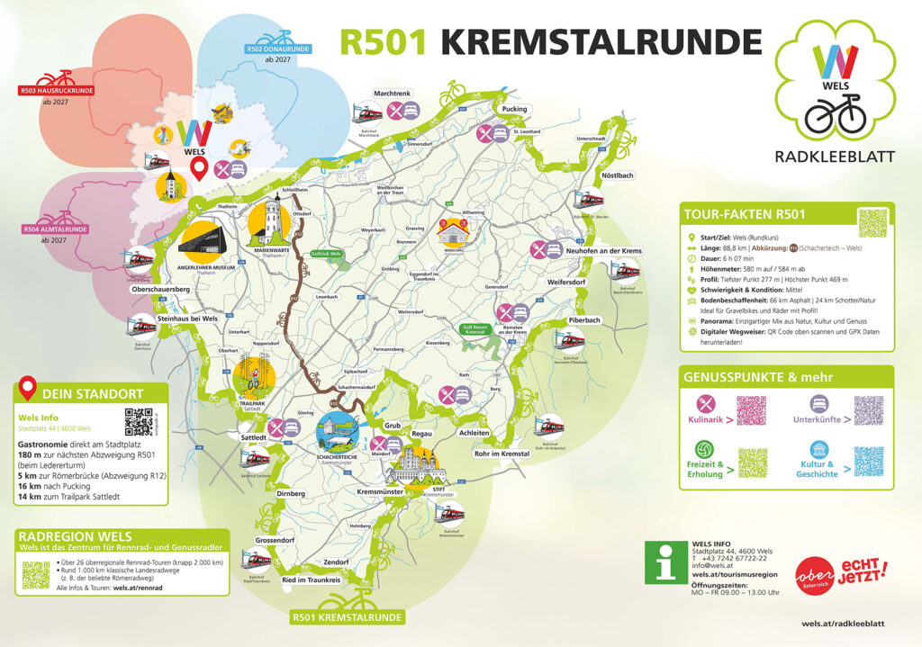 Die Kremstalrunde ist erst der Anfang. Bis 2027 wird das „Welser Radkleeblatt“ um drei weitere Routen (R502, R503, R504) ergänzt, sodass pünktlich zur OÖ Landesgartenschau vier beschilderte Gravel- und Freizeit-Runden zur Verfügung stehen.